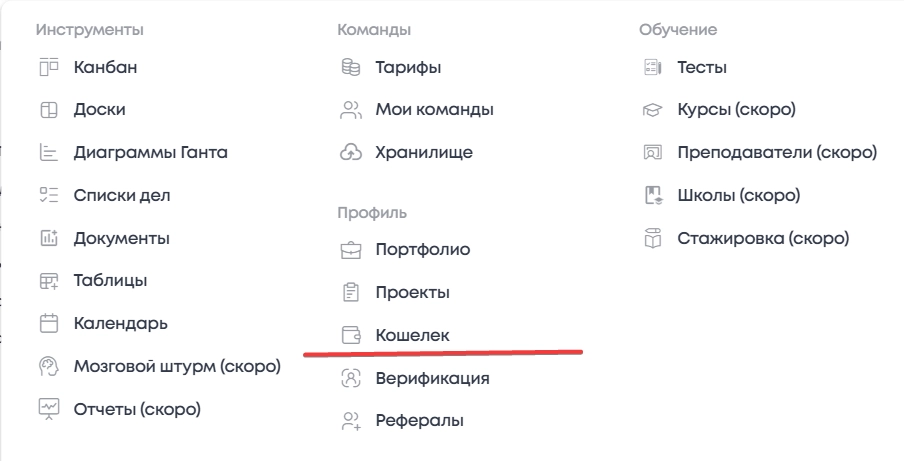 1. В верхнем горизонтальном меню "Сервисы" выбрать раздел "Кошелек".