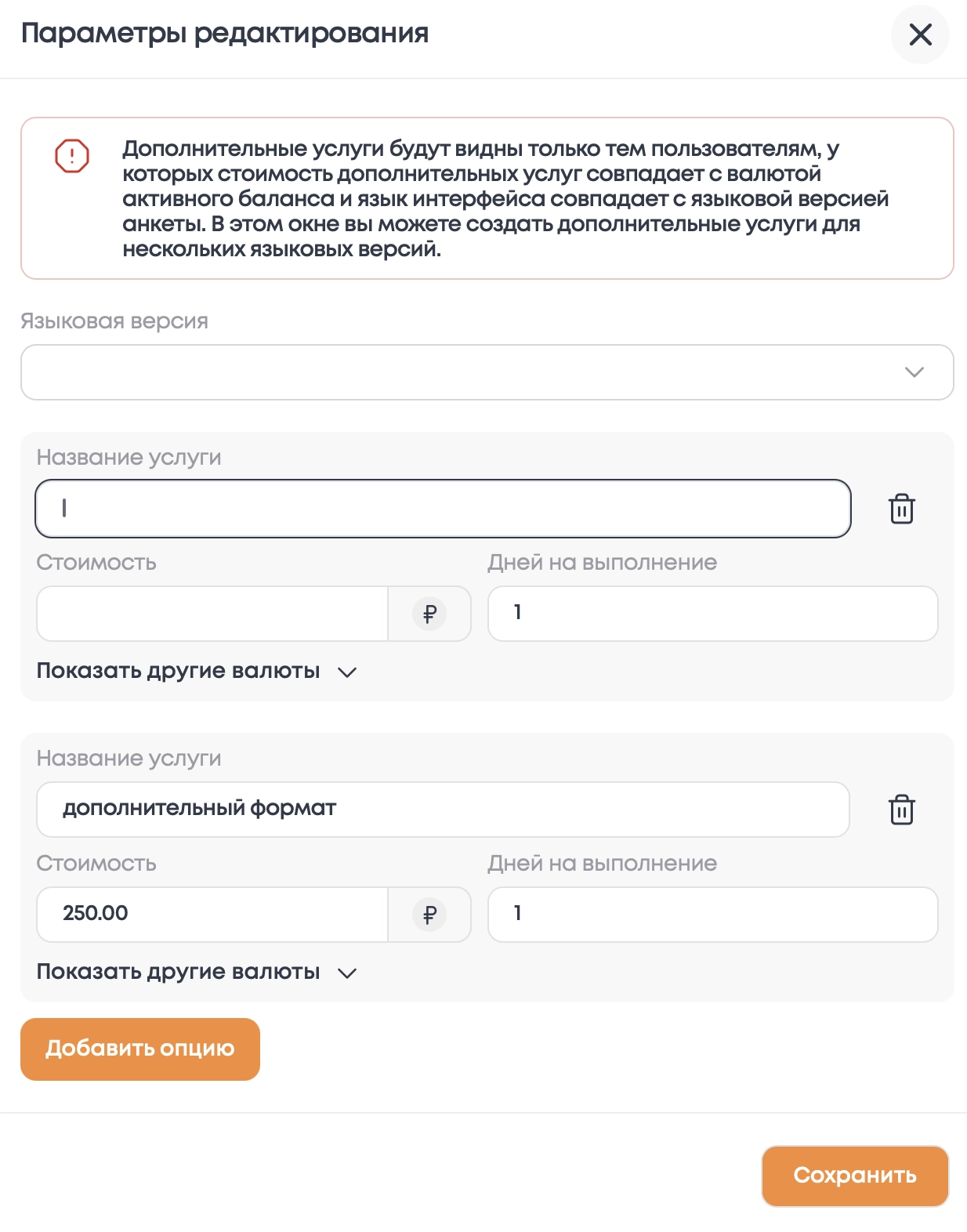 - Выбрать языковую версию — услуга будет отображаться только пользователям с таким же языком интерфейса.