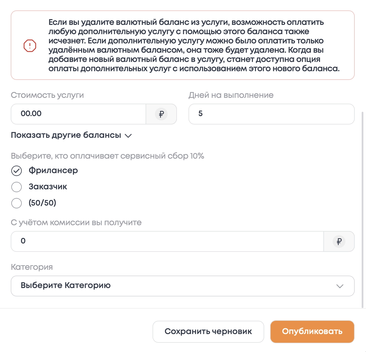 Открыть раздел «Фриланс маркетплейс» и перейти в блок «Мои услуги». Нажать «Создать услугу» — откроется форма для заполнения.