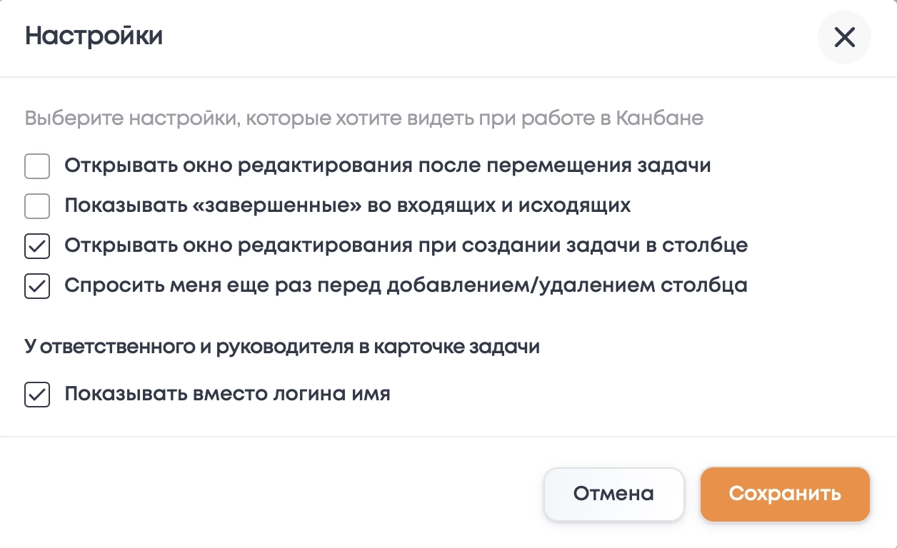 - Кнопка "Настройки" - глобальные настройки Канбана