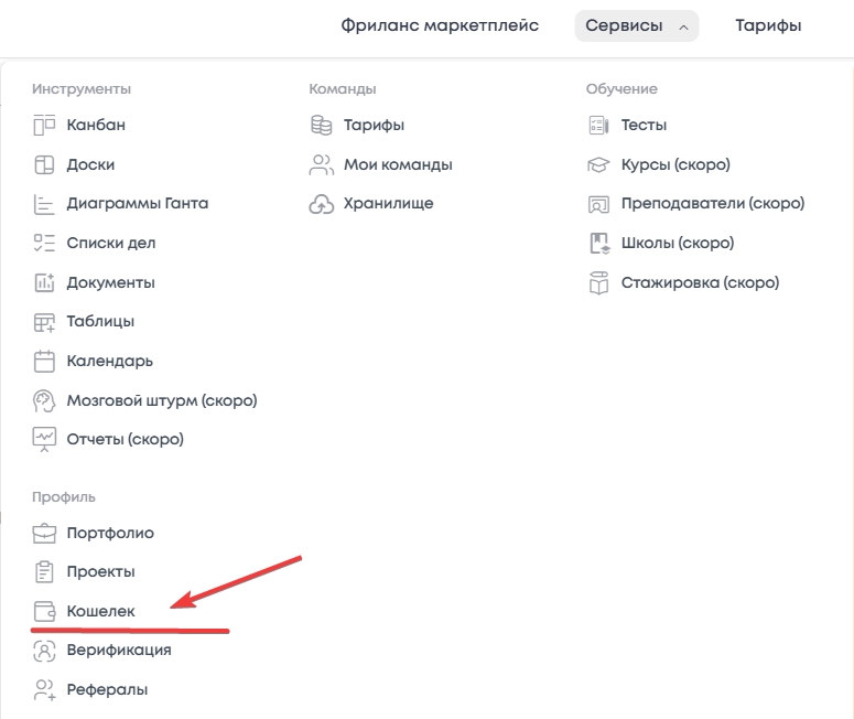 В выпадающем или открывшемся списке сервисов выберите "Кошелек".