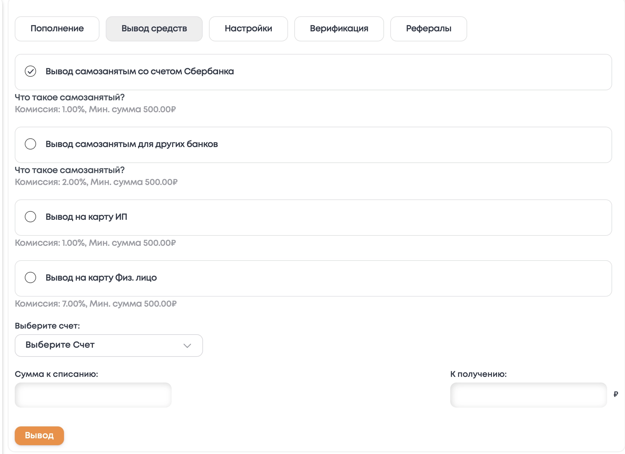 1. Вывод самозанятых со счетом Сбербанка2. Вывод самозанятых для других банков