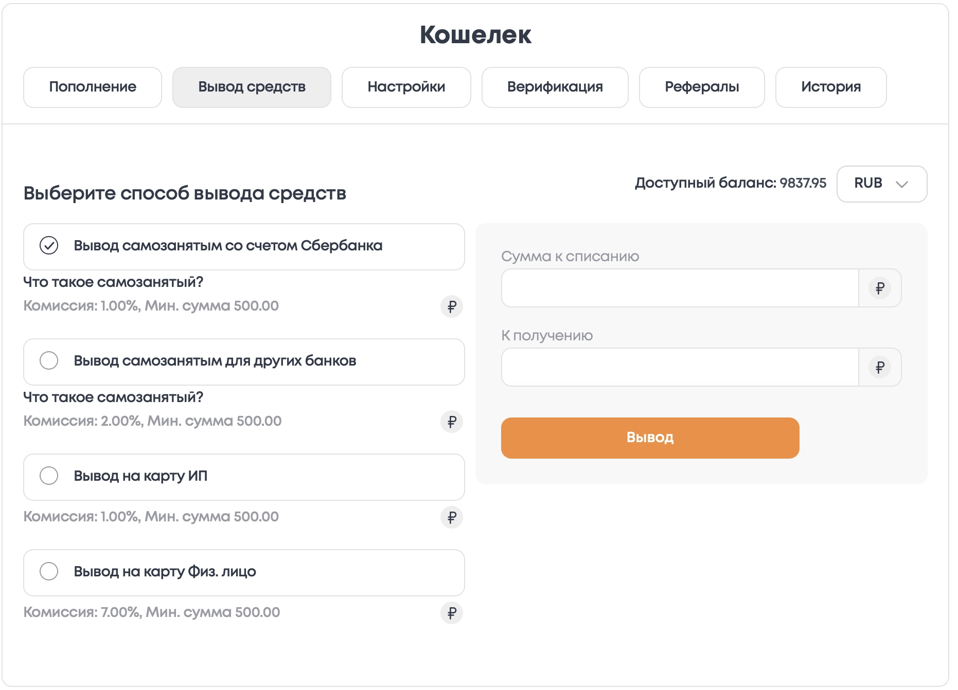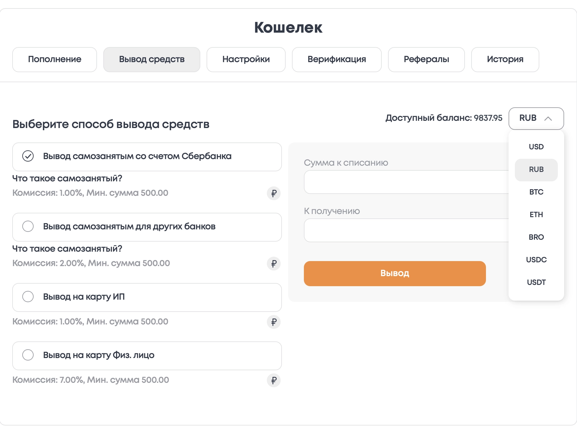Далее выбрать способ вывода средств согласно выбранной валюте