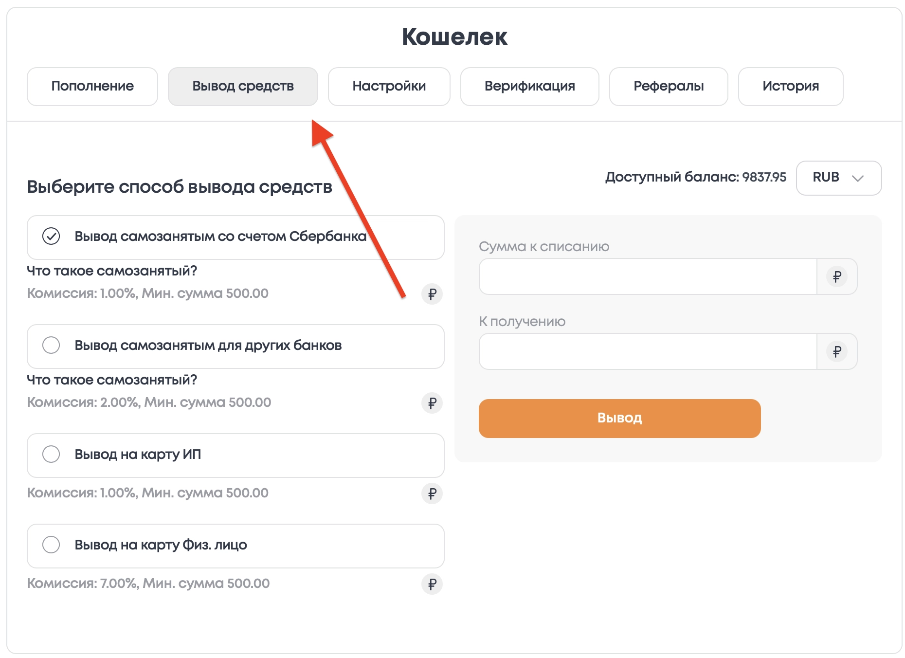 Перейти на вкладку "Вывод средств".