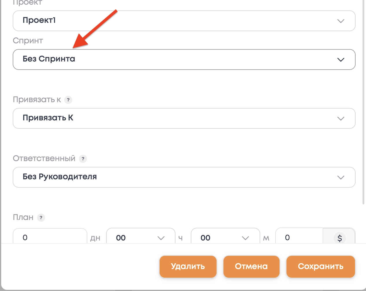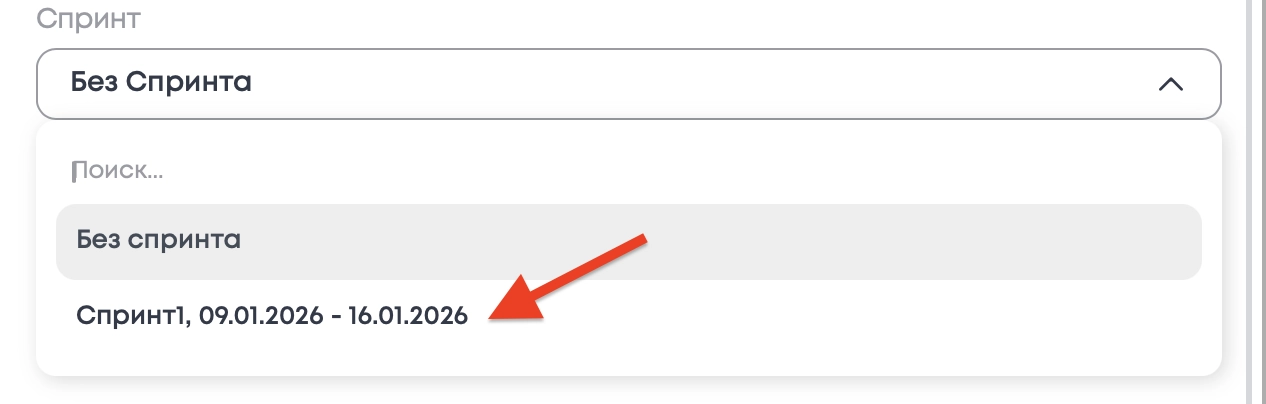 3. В окне редактирования задачи найти поле «Без спринта», из выпадающего списка выбрать созданный спринт и сохранить изменения.
