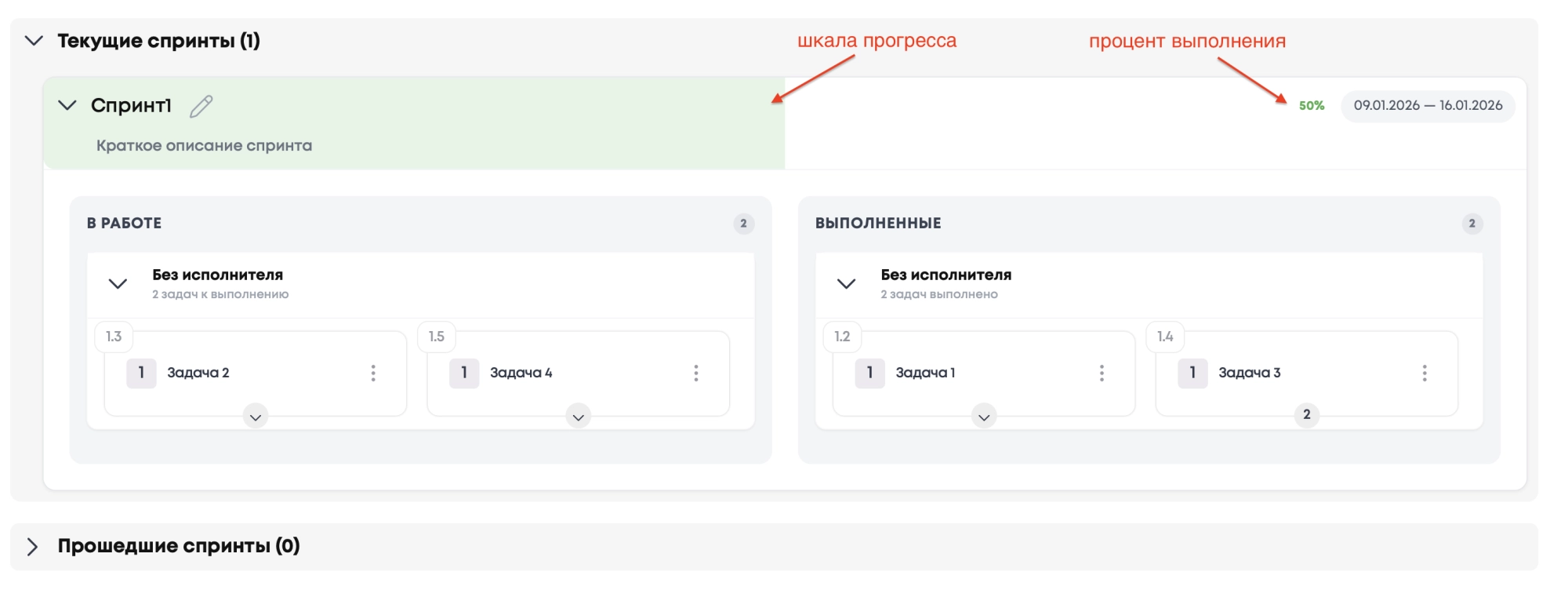 После окончания даты спринта спринт автоматически перемещается в раздел «Прошедшие спринты».